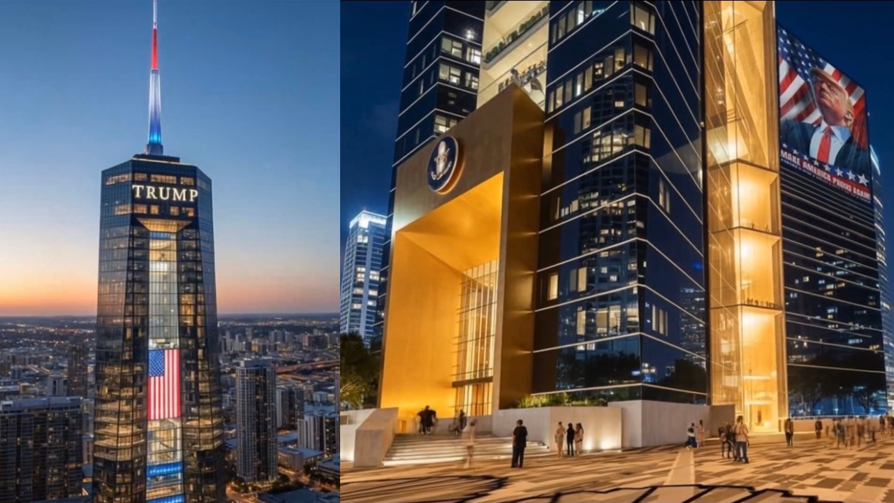 The preview shows a skyscraper wrapped in big gold letters of Trump’s name with an American flag running down the center of the facade and a red white and blue-lit spire on top. The building sits on the water and includes an outdoor terrace meant for public events. If you like architecture that makes a statement this one will not be shy about it.