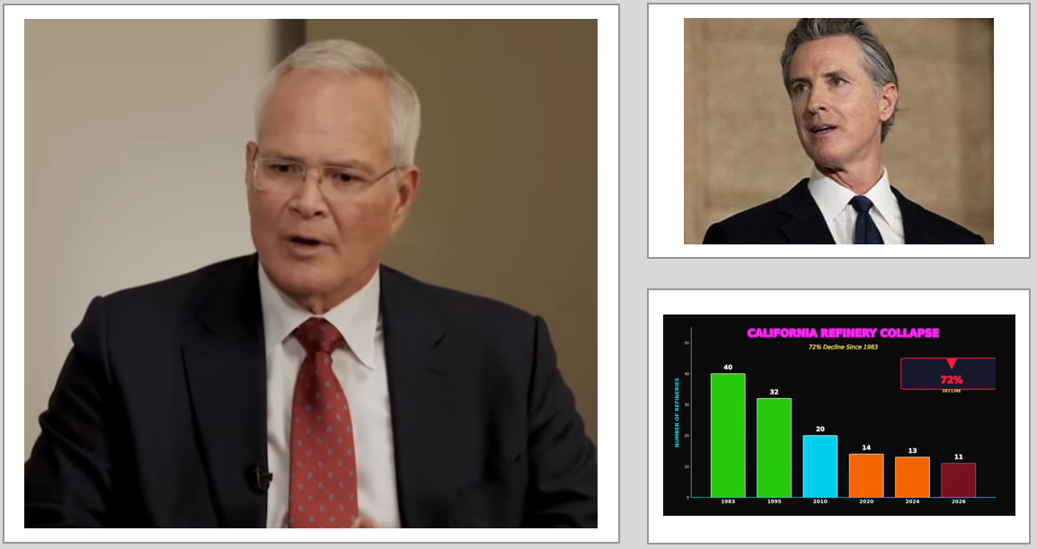 This isn’t just about Exxon. Chevron is moving jobs to Texas. Phillips 66 shut down its Los Angeles refinery. Valero closed its Benicia facility after getting slapped with the largest refinery fine in state history. California once had 40 refineries. By 2026, projections say 11 may remain. That’s not a transition—that’s an engineered supply collapse. When politicians pretend shock at rising gas prices, they’re reacting to consequences they deliberately created.