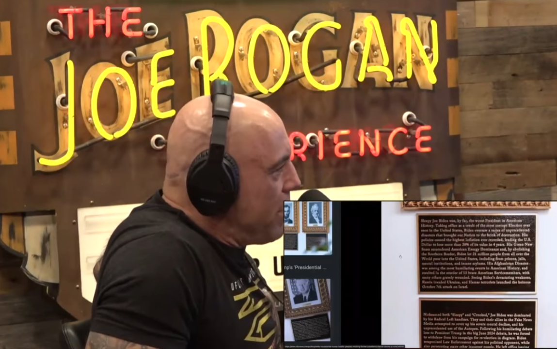As Rogan reads language calling Joe Biden the “worst president in American history,” alleging a “corrupt election,” listing global conflicts as personal failures, mocking nicknames, and ending with Trump “saving America” in all caps, his tone shifts from amusement to alarm, because whatever you think of Biden, that’s not how American history has ever been documented inside the People’s House.